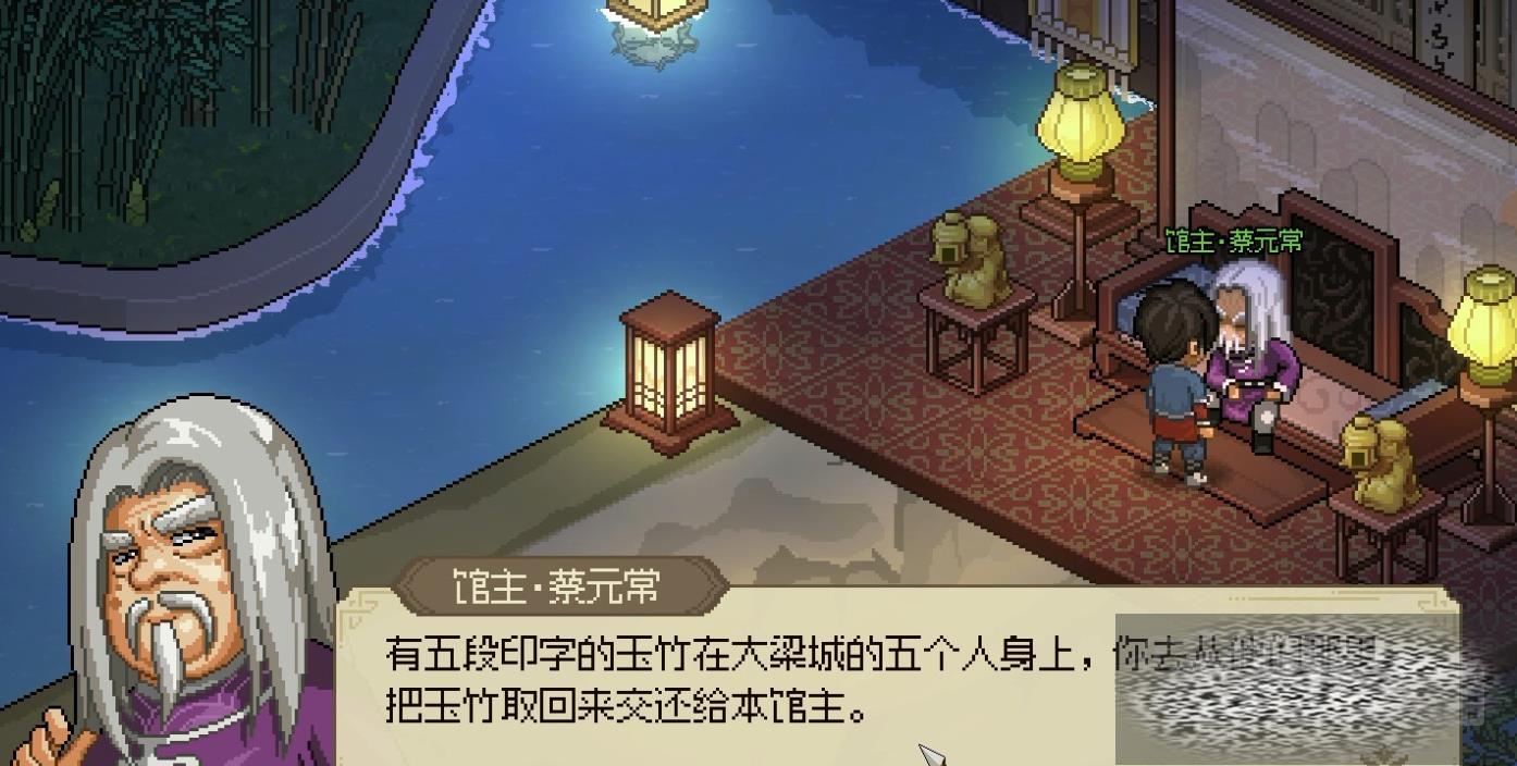 接着来到大梁城右边的桥上这里有一位老头,老头会让我们帮助寻找草鞋,第一个草鞋在桥右边的角落,第二个在报国寺的门口,全部找齐后给他就能得到一个礼字的玉竹,最后和茶摊附近的婆婆猜字谜能得到一个智字的玉竹,将这五个全部集齐后交给馆主就可以加入儒圣馆了。
