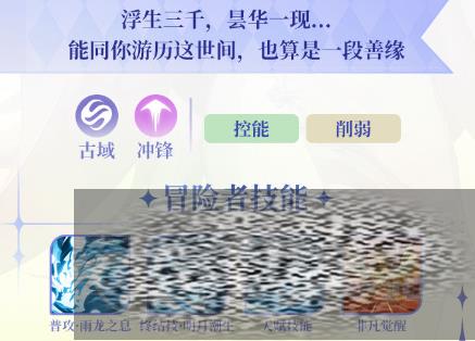 她的普通攻击叫做雨龙之息,通过雨滴对敌人造成伤害。天赋技能则可让她不断的恢复能量,如此就能更快地用出主动技能。三技能的话就可以让她觉醒能力,让她的攻击可以对敌人造成击退效果。带有一定的控制能力,并有效增强伤害。