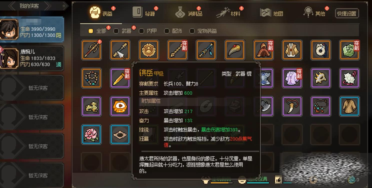 以上内容就是本期小编给大家带来的大侠立志传镇岳获取攻略的全部内容了,值得一提的是,在获得了镇岳之后,由于玩家必须结缘唐婉儿,所以陆剑南对于玩家的好感度会有所降低哦,希望看完本期内容的小伙伴们可以实际进入到游戏内体验一下。
