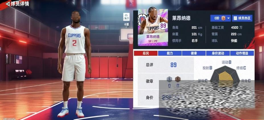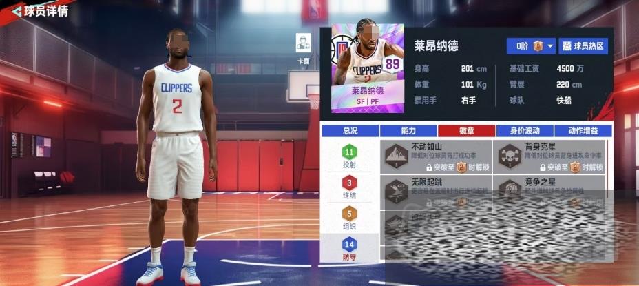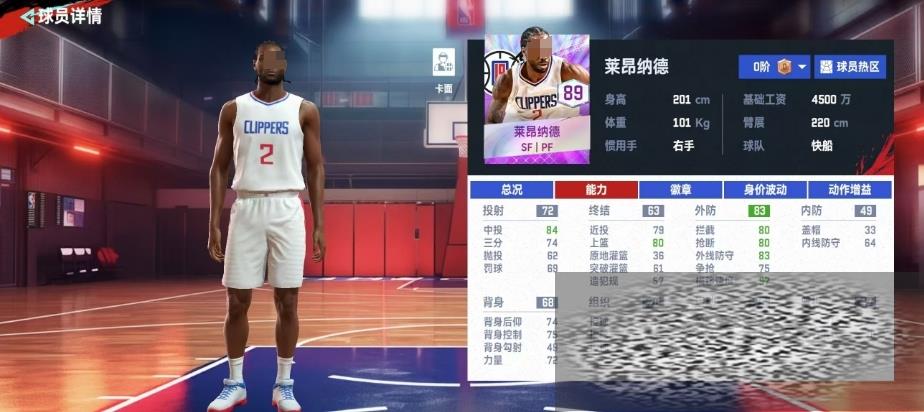 玩家可以通过合理运用他的强项,同时规避他的弱点,将莱昂纳德打造成球队中的关键人物,莱昂纳德的身高和臂展为他在游戏中的防守端提供了坚实的基础,他的身高达到201cm,臂展更是达到了惊人的220cm,作为快船队的一员也是效果不错的。