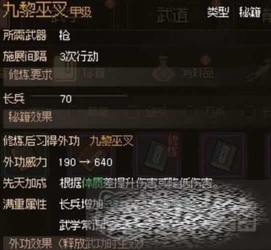 在大侠立志传的江湖中,绝世武功总是令无数侠客趋之若鹜。然而,想要掌握这些武功,往往需要付出极大的代价。今天我们要介绍的是大侠立志传九黎巫叉获取攻略。九黎巫叉属于甲级枪法,这门武功不仅威力非凡,还蕴含了神秘的苗疆巫术。许多玩家对其获取方法感到困惑,因此本文将为大家详解如何通过献祭来获得这门武功。