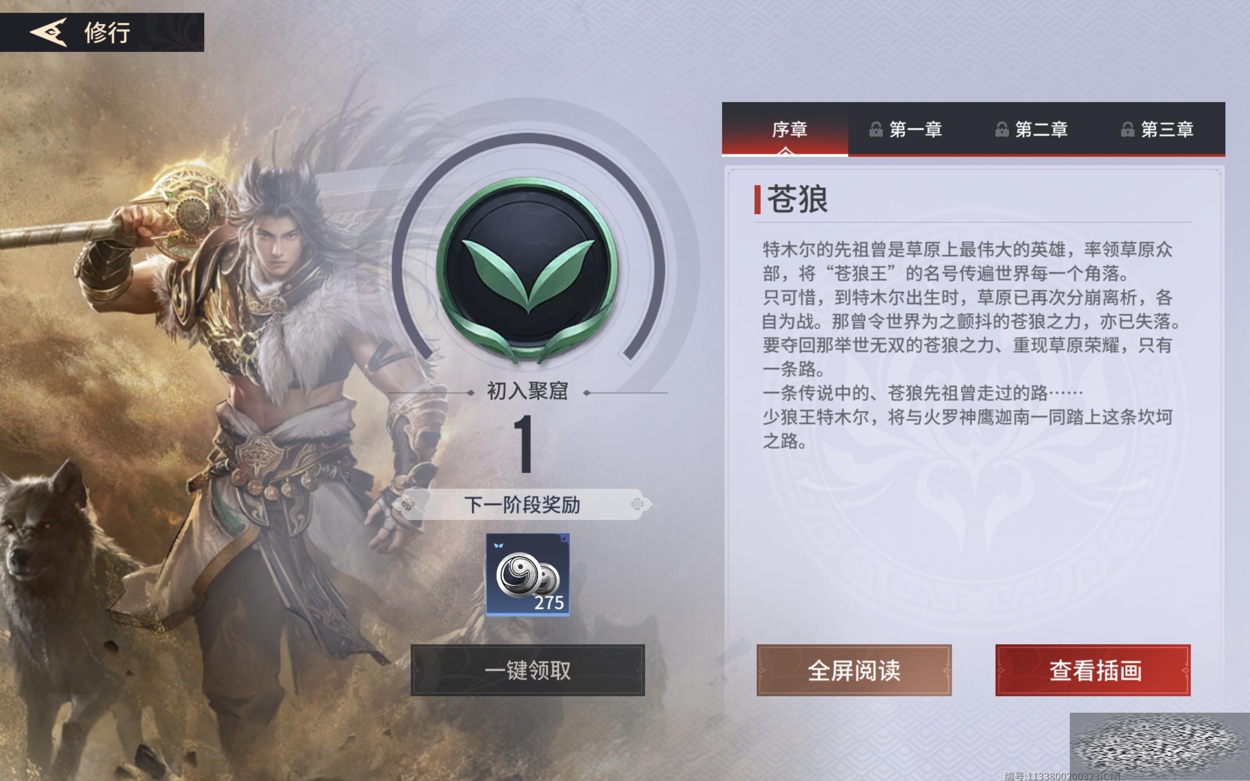 到了修行专属的区域之后,你就能看到特木尔自己专属的一段故事剧情,平台将整个支线故事分成了四个章节,特木尔的修行等级每升高五级,就能解锁全新的部分,你不仅能看到相关的文章,还能浏览多张制作精良的插图,厂商还为每一张图搭配了贴合度很高的BGM,让大家收获极佳的视听体验。