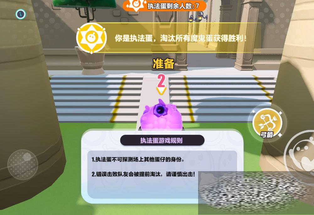 执法蛋可以用弓箭来从远处攻击,打到魔鬼蛋技能淘汰掉对方,但如果不小心打到了执法蛋则自会被淘汰,因此在没有十足把握的时候不要轻易出击哦!或许有人会问那执法蛋岂不是很被动?设计者也考虑到了这个,所以在地图上会有很多小蜡烛和大蜡烛,拾取能缩短游戏时间,毕竟只要时间到了执法蛋还活着就能获胜。