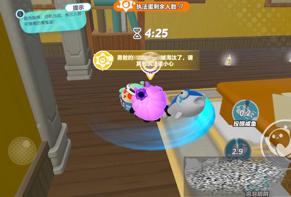 魔鬼蛋则是用咸鱼棒来进行攻击,这个咸鱼棒既能近战也能从远处丢过去,可以趁着对方在救人的时候从背后来一棒子!需要注意的是一旦你淘汰了谁,会有公屏播报,这也意味着你的身份曝光了要立刻转移。魔鬼蛋能布置只有执法蛋才会中招的陷进,将其困住,需要其他执法蛋来救,而魔鬼蛋就能趁机下手!值得一提的是陷进也能用来当掩体挡弓箭哦!