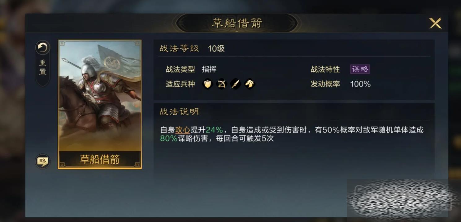 第二种韬略效果是将自身的攻击提升到24%,当自己受到伤害的时候有50%的几率增加80%的伤害,只要掌握这两个效果,就可以玩好这个角色。